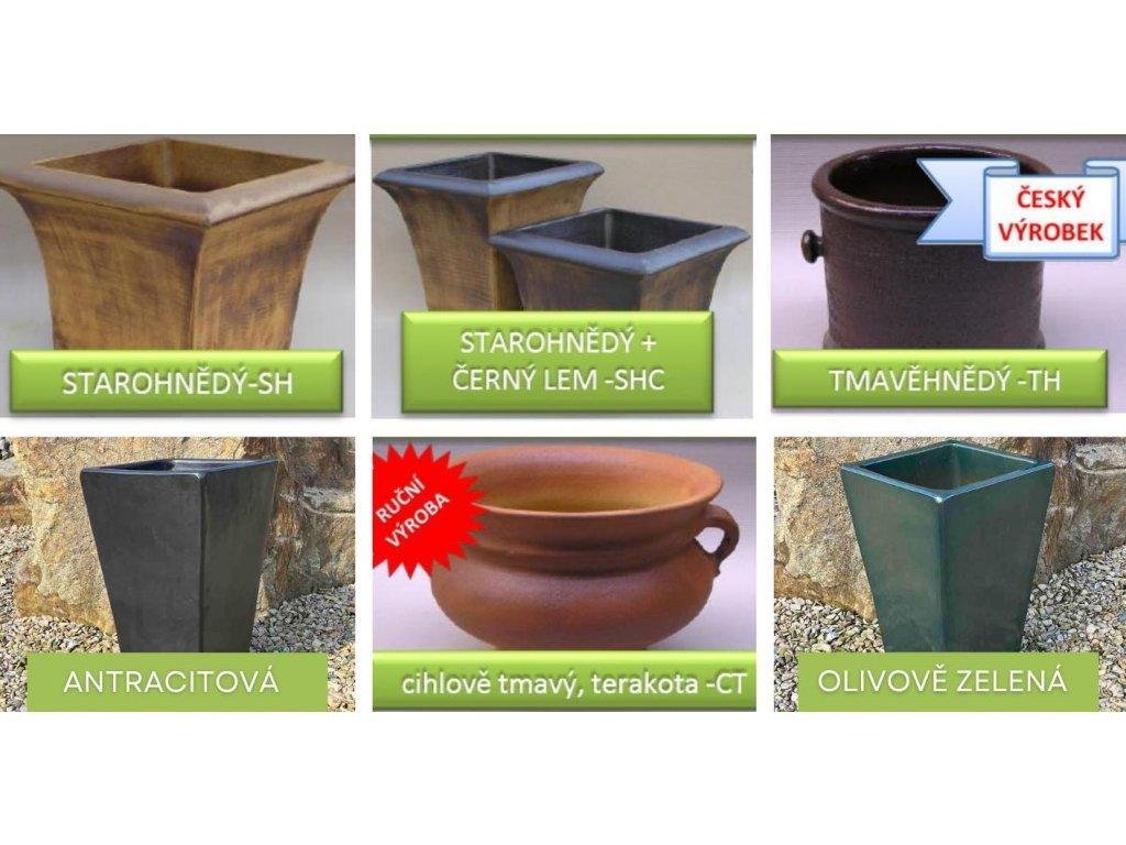 Můžete si vybrat klasické a moderní barevné odstíny glazur zahradní keramiky jako jsou: starohnědá, starohnědá s černým lemem, tmavěhnědá, cihlově červená - terakota, antracitová, olivově zelená.