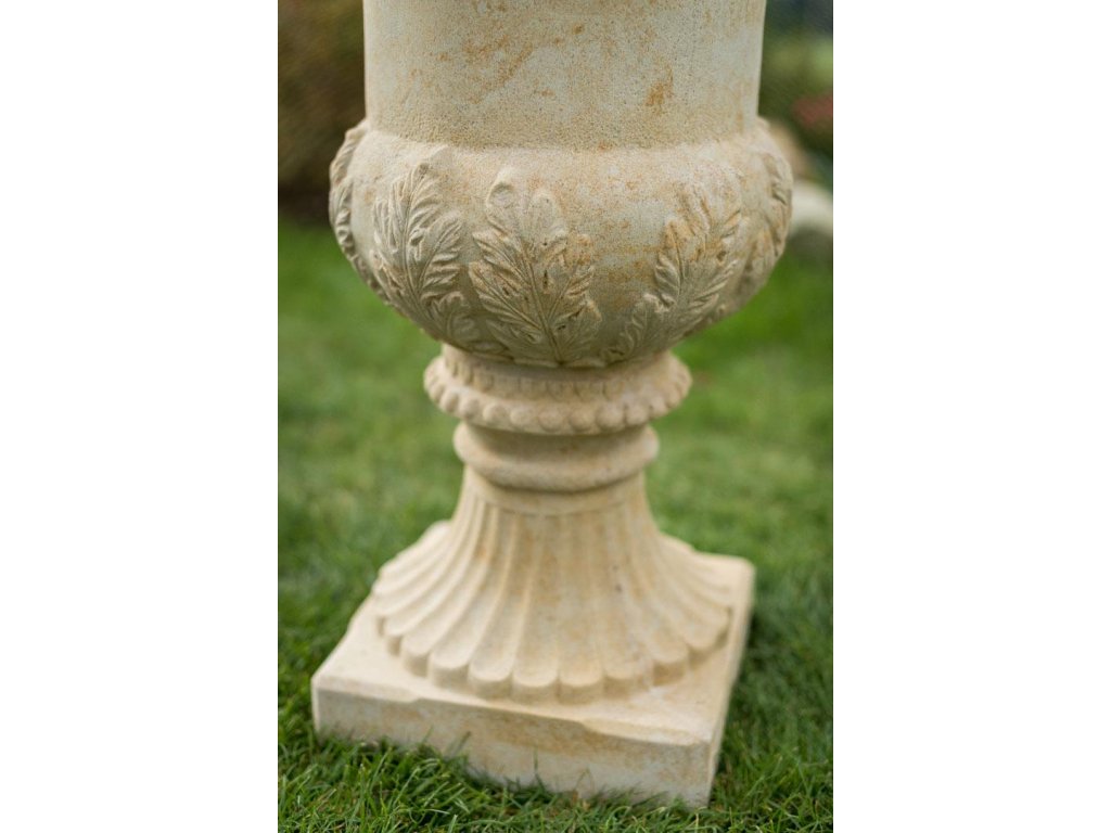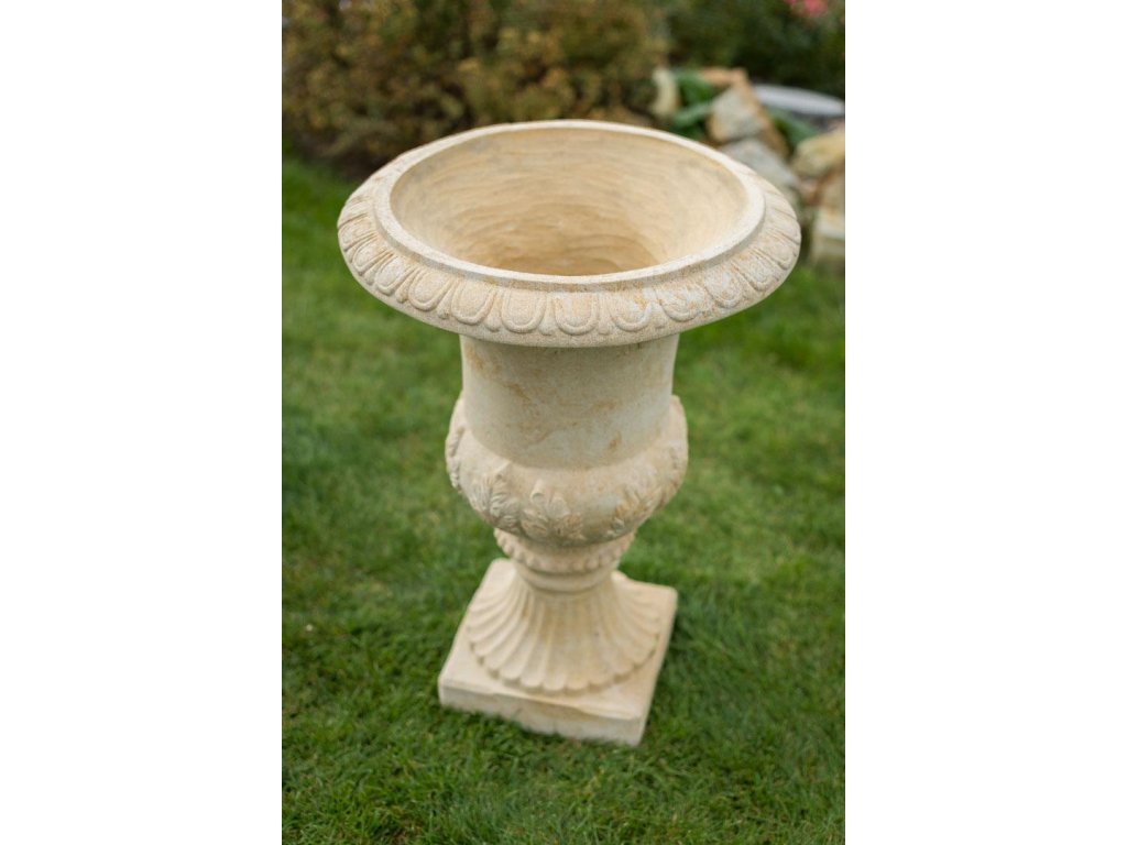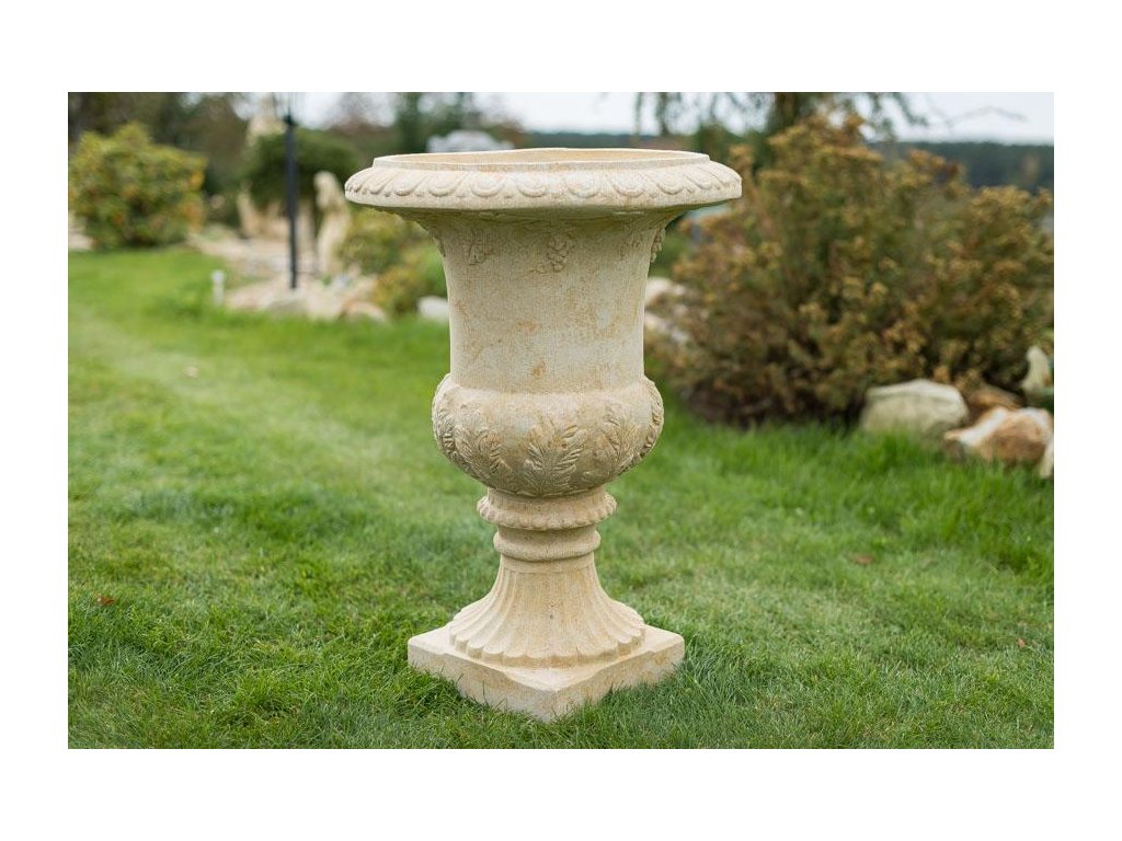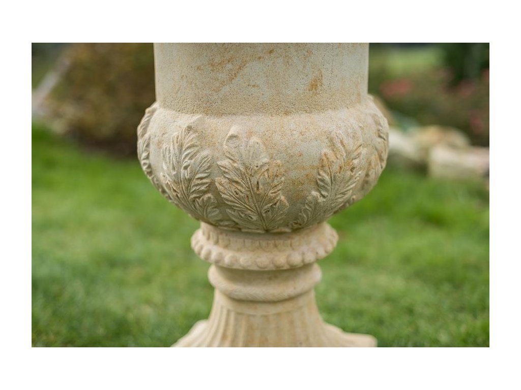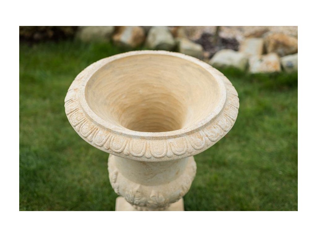 Kamenné květináče ve formě vysoké vázy jsou ideální volbou pro vytvoření dominantního a slavnostního prvku v zahradní architektuře. Tento model stojí na elegantním kruhovém sloupku, který přechází do obdélníkové patky, zajišťující vysokou stabilitu. Tělo vázy je zdobeno plastickými reliéfy a zakončeno bohatě profilovaným horním lemem, který působí reprezentativně a sochařsky. Celý květináč je vyroben z umělého pískovce, což zaručuje jeho pevnost, odolnost vůči mrazu i dlouhou životnost.